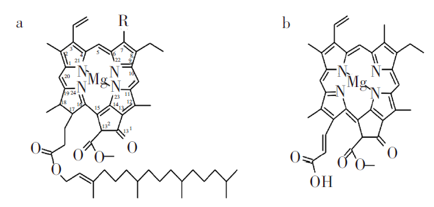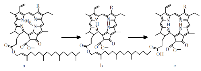 光合作用中最重要的色素是叶绿素,叶绿素能够吸收可见光,从而将获得的能量用于碳水化合物的合成[8]。叶绿素核心部分是1个卟啉环,其是由4个吡咯类亚基通过次甲基桥(=CH-)连成的一个平面大环,环绕在环上的电子可以自由迁移,这增加了叶绿素获得或失去电子的潜力,同时也解释了它在酶、酸、氧、光和热的存在下的不稳定性[11]。平面大环中间与一个镁离子(Mg2+)结合,Mg2+带正电荷,与其相连的氮原子则带负电荷,因而卟啉环具有极性和亲水性,可以与蛋白质通过非共价键结合在一起,蛋白质能够保护叶绿素免受细胞内存在的有机酸的破坏。叶绿素另一部分是一个很长的脂肪烃侧链,称为叶绿醇,该脂肪族链亲脂,因而叶绿素具有脂溶性[12]。不同的叶绿素在吡咯环上含有不同的取代基团,海藻中鉴定出的叶绿素c为叶绿素