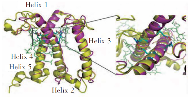 同类囊体膜结合的色素-蛋白质复合物主要有3种:光系统Ⅰ(PSⅠ)反应中心色素蛋白复合物、光系统Ⅱ(PSⅡ)反应中心色素蛋白复合物和捕光色素蛋白复合物(LHC),同PSⅠ结合的捕光色素蛋白复合物记为LHCⅠ,同PSⅡ结合的捕光色素蛋白复合物记为LHCⅡ。与高等植物相比,针对褐藻PSⅠ和PSⅡ色素蛋白复合物的相关研究较少,但是无论是藻类还是高等植物,两个光系统的反应中心在进化上具有一定的保守性。同高等植物相比,褐藻PSⅡ色素蛋白复合物的多肽分子量较大,但有结构上的相似性和同源性[15]。褐藻LHC的N末端突出于叶绿体基质中,C末端位于类囊体腔中。褐藻LHC具有3个α螺旋的跨膜区,其中第一和第三螺旋的氨基酸序列在植物界中高度保守,通过谷氨酸-精氨酸和精氨酸-谷氨酸盐桥形成稳定的X型空间结构。α螺旋固定在类囊体的双层磷脂膜上并通过非共价键与色素结合,第一和第三螺旋是叶绿素a的结合位点。在高等植物中,推测第二螺旋应该是叶绿素b结合点,而在褐藻中则是叶绿素c的结合位点[16-17]。徐才哲等[18]参考菠菜LHCⅡ模型,建立三角褐指藻捕光色素蛋白复合物(岩藻黄素-叶绿素蛋白复合体,FCP)的三维结构模型,FCP的模拟结构与菠菜LHCⅡ结构的重叠图如图2所示,图中显示FCP没有2和5两个螺旋,但是1、3和4三个跨膜螺旋几乎与菠菜LHCⅡ的跨膜螺旋完全重合,长度有差异,这预示FCP的三维空间结构与菠菜LHCⅡ相似。综上所述,褐藻和高等植物中色素-蛋白质复合物结构具有相似性,因而推测两者的变色失绿现象具有相通的机理机制。