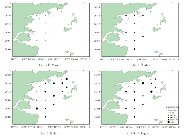 闽江口鱼类资源平均质量密度指数为667.10 kg·km-2,平均数量密度指数为71.91×103 ind·km-2。其中,质量平均资源密度指数以7月最高,为1 109.13 kg·km-2,其次是8月,为960.01 kg·km-2,3月最低,仅94.77 kg·km-2(P<0.01);平均数量密度指数以5月份最高,为120.07×103 ind·km-2,其次是8月份,为82.92×103 ind·km-2,也是3月最低,仅7.80×103 ind·km-2(P<0.01)。按季节计算,春、夏季鱼类质量资源密度分别为299.63 kg·km-2和1 034.57 kg·km-2;数量密度分别为63.94×103 ind·km-2和79.89×103 ind·km-2。