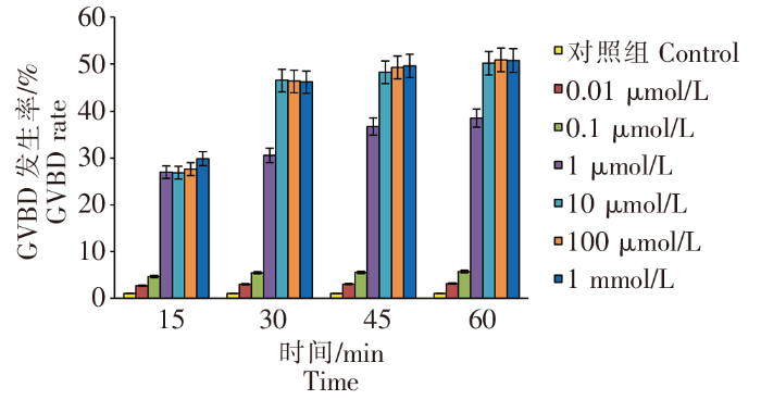 钝缀锦蛤解剖卵母细胞在正常海水中浸泡一段时间后,生发泡几乎不会发生破裂;采用5-HT浸泡可以显著促使钝缀锦蛤卵母细胞的成熟(图2)。当处理时间相同时,采用10 μmol/L~1 mmol/L 5-HT 浸泡钝缀锦蛤卵母细胞,GVBD发生率差异不显著(P>0.05);采用0.01 ~1 μmol/L 5-HT 浸泡钝缀锦蛤卵母细胞,GVBD发生率差异显著(P <0.05),表现出一定的浓度依赖关系。除45 min和60 min同一浓度实验组之间差异不显著(P>0.05)外,其他不同时间同一浓度实验组差异显著(P <0.05),表现出一定的时间依赖关系。