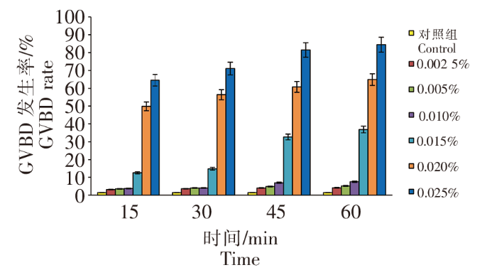 对钝缀锦蛤解剖卵母细胞采用一定浓度的氨海水浸泡,可以显著促使卵母细胞的成熟(图4)。当处理时间相同时,采用0.002 5%~0.010%氨海水浸泡钝缀锦蛤卵母细胞,GVBD发生率差异不显著(P>0.05);采用0.015%~0.025%氨海水浸泡钝缀锦蛤卵母细胞,GVBD发生率差异显著(P <0.05),表现出一定的浓度依赖关系。除了0.002 5%氨海水实验组外,其他实验组随着处理时间的增加,GVBD发生率差异显著(P<0.05),表现出一定的时间依赖关系。