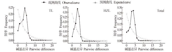 另外,鱼类的遗传多样性模式与其进化历史密切相关,当Hd≥0.5、Pi<0.005时,认为是受瓶颈效应影响后种群数量的迅速扩张而导致,因核苷酸多样性的积累时间比单倍型多样性更漫长得多,从而形成高Hd、低Pi模式[31]。通常利用中性检测和歧点分布曲线推测群体的历史动态,若Fu's Fs和Tajima's D检验结果为负值且具有显著性差异,歧点分布曲线呈单峰型,则说明序列中含有比中性进化模型更多的核苷酸位点变化,可能预示种群经历过一个扩张的历史[35-36]。本研究结果显示,翘嘴鲌太湖和洪泽湖群体的Fu's Fs和Tajima's D中性检测结果均为负值,Fu's Fs统计检验具有极显著性差异(表4),且核苷酸歧点分布曲线具有典型的单峰型(图2),表明翘嘴鲌在历史上经历过群体扩张事件[28],形成了高Hd、低Pi的遗传多样性模式。