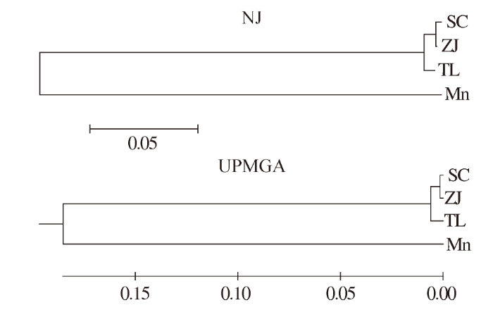 根据COⅠ基因序列,从GenBank中下载与罗氏沼虾同属不同种的日本沼虾(Macrobrachium nipponense,Mn)(登录号:FM958077)作为外群,采用NJ法和UPMGA法构建系统进化树。由图1可知,2种方法构建的系统进化树趋于一致,沼虾属的2个种聚为两大支:日本沼虾的遗传距离与罗氏沼虾3个群体均明显偏远,单独聚为一支;SC群体与ZJ群体遗传距离最近,首先聚在一起成为一小支,然后再与TL群体聚为另一支。