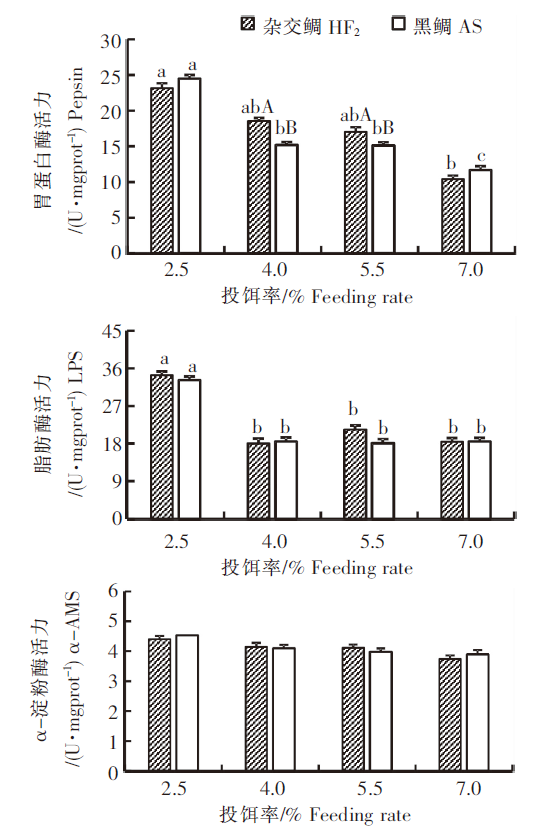 不同投饵率下杂交鲷及黑鲷消化酶活力比较
