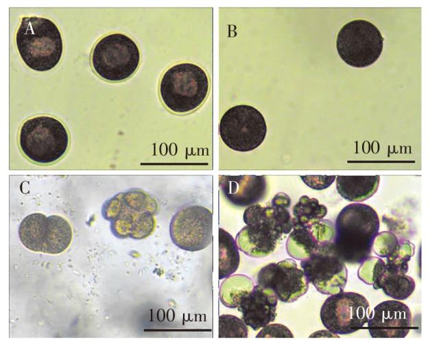 注:A.生发泡未破裂的卵子;B.生发泡破裂的卵子;C.正常的受精卵;D. 畸形的受精卵。