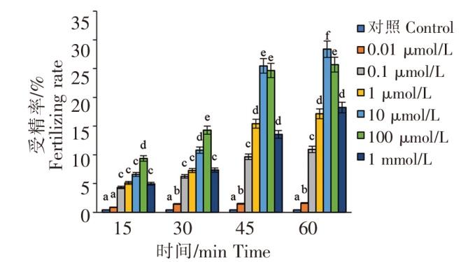 菲律宾蛤仔卵子经过不同浓度的5-HT处理液浸泡后进行人工授精,随着受精时间的延长,受精率均显著升高(P<0.05),表现出时间依赖关系(图3)。当处理时间相同时,表现出一定的浓度依赖关系,10~100 μmol/L 5-HT处理组的卵子受精率显著高于其他处理组(P<0.05)。其中,采用10 μmol/L 5-HT处理液浸泡菲律宾蛤仔卵子60 min获得的受精率最高,为28.38%。