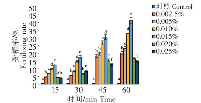 菲律宾蛤仔卵子经过不同浓度的氨海水处理液浸泡后进行人工授精,随着受精时间的延长,受精率均显著升高(P<0.05),表现出时间依赖关系(图5)。当不同浓度氨海水处理组的处理时间相同时,受精率表现出浓度依赖关系。0.010%~0.015%氨海水处理组的卵子受精率显著高于其他处理组(P<0.05),其中0.015%氨海水处理浸泡60 min的卵子的受精率最高,达到41.28%。