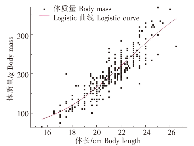 使用Logistic曲线进行高体鰤的体长、体质量关系拟合,拟合效果见图10,整体增长较为平稳,增长速率变化不大,未呈现较为明显的S型曲线。
