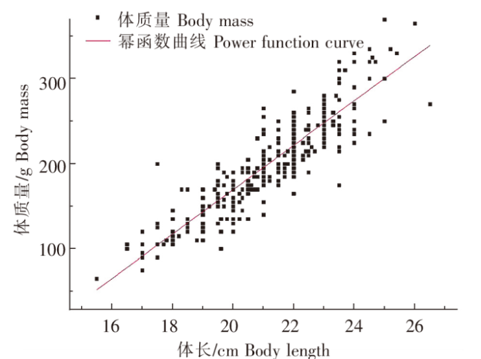 利用幂函数,选择体长和体质量两项因素完成高体鰤体态特征与体质量关系的拟合,拟合曲线见图11。