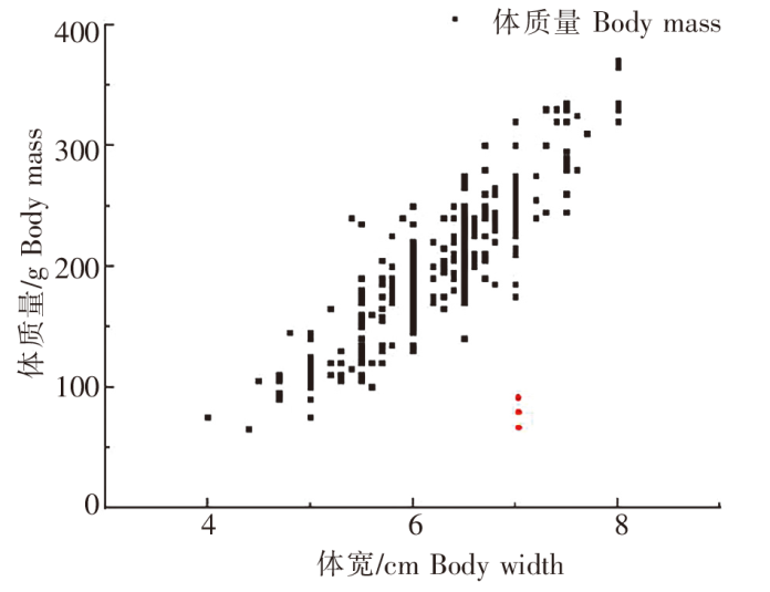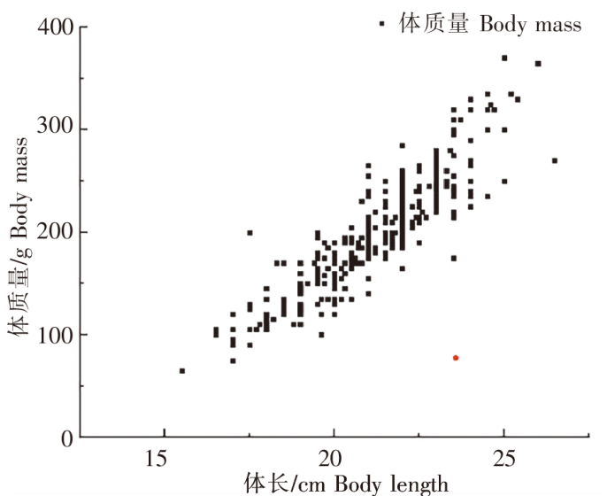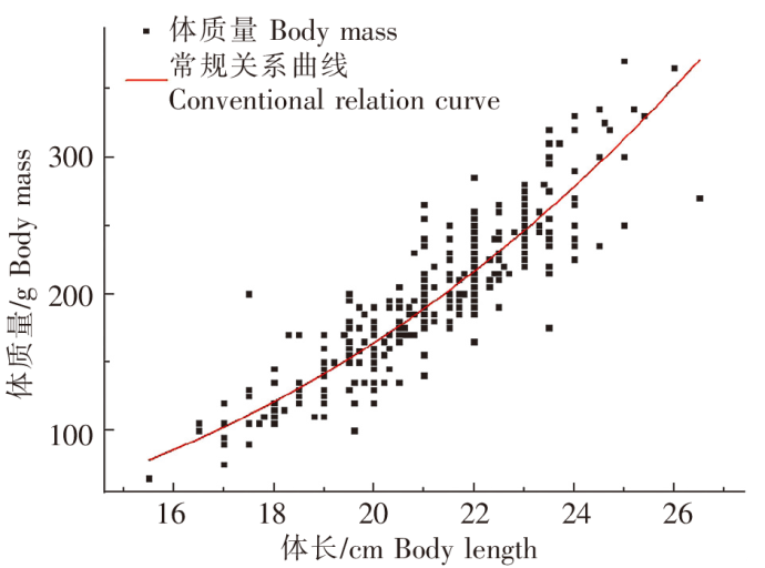 式(3)中:μ为数学期望;σ2为标准方差。常见应用数学模型拟合鱼类体质量与体态特征关系时,大多选择体长和体质量两项参数。