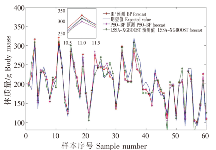 由上述数学模型拟合效果可知,针对此次高体鰤养殖实验测量数据的常规数学模型拟合并非最优方法。神经网络模型属于自适应非线性模型,大量数据表明,人工神经网络在处理常见回归拟合问题时有优异表现[28],除传统BP神经网络外,多种优化BP模型如遗传算法优化BP(GA-BP)、粒子群优化BP(PSO-BP)等都具有处理回归拟合问题的能力,这些优化算法大多在BP神经网络初始化时采用寻优算法获取最佳的权值、阈值等初始参数,从而有效提高BP神经网络拟合精度。PSO-BP是较为常见的群体寻优算法,在解决回归预测问题时常常优于GA-BP和传统BP [29]。本文选用传统BP神经网络以及PSO-BP神经网络与LSSA-XGBOOST算法对比,结果如图15所示,传统BP神经网络拟合度R2为0.877 5,粒子群优化BP为0.910 5,而本文所用LSSA-XGBOOST模型相关性系数R2为0.947 9。以图15中第11个点拟合效果为例,BP和PSO-BP神经网络的拟合误差已经接近其最佳误差,而LSSA-XGBOOST每棵树模型的预测都使用shrinkage,削弱其对结果的影响,从而提升整体模型的泛化能力,为后续训练留出更多的学习空间,有效地防止过拟合。此外,常见神经网络算法需要大量数据以支撑其算法模型的深度和训练量,从而提高预测精度,而XGBOOST则不需要太过庞大的数据集,这是由于决策提升树模型在训练过程中遵循确定性原则,而确定性原则使其更容易记住简单的数据变化规律,一旦规律过于复杂,其学习效果便会弱于神经网络模型。