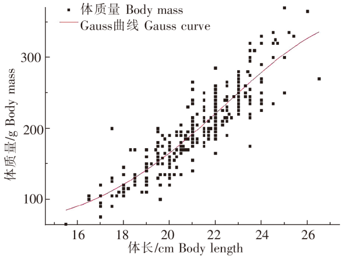 使用Gauss曲线拟合高体鰤体长-体质量关系,拟合效果见图9,整体数据集呈正相关趋势,数据点均匀分布在曲线两侧,曲线终点尚未达到峰值,未呈现完整的山峰形Gauss曲线。
