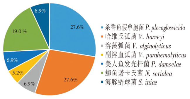 本研究结果表明,大黄鱼体内分离得到的最主要病原菌为杀香鱼假单胞菌、哈维氏弧菌和鰤鱼诺卡氏菌。杀香鱼假单胞菌为引起大黄鱼近年来高发疾病之一的内脏白点病主要的病原菌[15-16],哈维氏弧菌、溶藻弧菌、副溶血弧菌会引起大黄鱼体表溃疡、肛门红肿、鳍条出血、内脏及肠道病变[17⇓-19]。鰤鱼诺卡氏菌最早由王国良等[20]从浙江网箱养殖大黄鱼上分离得到,患病鱼体表皮下脂肪和肌肉形成脓疮,呈现大小不一的鼓起软包,脾、肾肿大并有白色结节。美人鱼发光杆菌为条件致病菌,一旦养殖水体环境恶化或鱼体免疫力下降,便可感染大黄鱼而使其发病[21]。另外,2022年分离得到的海豚链球菌是近几年开展大黄鱼流行病学调查以来的首次发现,患病鱼体上下颌充血、鳃盖软条骨间膜充血发红,甚至能引起大黄鱼大量死亡。因此,除对常规病原菌继续开展调查外,还需更加关注新的致病菌对大黄鱼的致病性等相关研究。