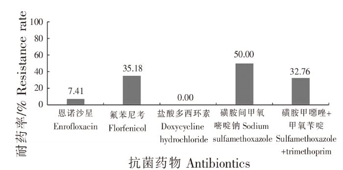 因中国渔业渔政管理局发布的SC/T 7028—2022《水产养殖动物细菌耐药性调查规范 通则》只列出细菌对氟苯尼考、盐酸多西环素、磺胺甲噁唑+甲氧苄啶、磺胺间甲氧嘧啶钠、恩诺沙星5种抗菌药物的耐药性判定参考值(S=敏感,I=中敏,R=耐药)[14],以及美国临床和实验室标准协会(CLSI)发布的药物敏感性及耐药性标准中也只有针对这5种药的数据,因此本文作耐药性分析时,不将硫酸新霉素、甲砜霉素、氟甲喹3种抗菌药物纳入统计。判别标准及菌株耐药率计算如下: