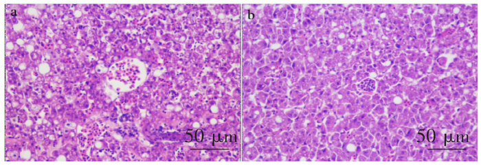 如图3所示,健康大黄鱼近似椭圆的多角形细胞为实质细胞,以放射性排列向四周扩散,部分胰脏组织嵌入肝组织中,经HE染色呈紫蓝色的为胰腺细胞间结缔组织,其呈现出较强的嗜碱性。在患病大黄鱼肝脏中未发现寄生的纤毛虫,发生明显的组织变化是肝脏细胞增生,细胞之间的界限不明显,中央静脉被压迫,单核细胞增多,实质细胞变大,结缔组织的嗜碱性减弱。