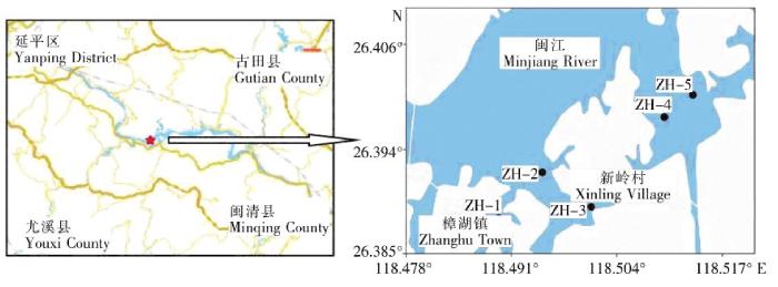 樟湖库湾养殖水域土壤主要为丘陵和水稻田土,土壤质地背景为黏土-黏壤土[8]。综合考虑水域面积、环境、网箱养殖情况等,采用GPS定位布设ZH-1、ZH-2、ZH-3、ZH-4和ZH-5等5个采样点,站位布设见图1。其中ZH-1(118.489° E、26.388°N)、ZH-2(118.494°E、26.392° N)、ZH-4(118.509°E、26.398°N)和ZH-5(118.513°E、26.400°N)位于网箱养殖区,养殖品种以草鱼为主,每个网箱养殖数量约3 000尾,主要投喂人工配合饲料,饲料中总氮(TN)和总磷(TP)的含量分别为4.52%和0.34%,日投饵量为鱼体质量的3%~10%。ZH-3(118.501°E、26.389° N)为对照点,位于未养殖区,该站位处于水流变缓停滞处,底质沉积稳定,且无网箱养殖等活动干扰,能较为准确地代表原环境。ZH-1~ZH-5水深分别为11、10、10、20、20 m。采用1/16 m2彼得森采泥器采集表层沉积物样品,样品采集后在厌氧条件下迅速装入干净的聚乙烯密封袋,驱除袋内空气并密封,运回实验室后于0~4 ℃的冰箱中保存,并于24 h内开展AVS测定,之后进行重金属实验。对于底栖动物采样,每个站位每次平行采集2次,再合并成一个大样。自2016年8月至2017年8月分5个时段进行样品采集,分别为2016年8月、11月,2017年2月、5月和8月。