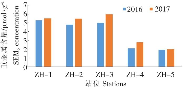 樟湖库湾表层沉积物AVS、6种重金属(Zn、Cr、Cu、Pb、Ni和Cd)及SEM6(SEM6= SEMZn+ SEMCr+ SEMCu+ SEMPb+ SEMNi +SEMCd)含量见表1、表2,结果表明,AVS含量范围在0.57~2.13 μmol·g-1之间,梯度分布为ZH-1>ZH-4>ZH-5>ZH-2>ZH-3,网箱养殖区普遍高于非养殖区,采用2016年与2017年同个月份的监测结果进行比较,网箱养殖区平均AVS含量有所上升(图2)。SEM6含量范围在1.66~6.35 μmol·g-1之间,梯度分布为ZH-3>ZH-1>ZH-2>ZH-4>ZH-5(图3)。单个重金属的含量梯度为Zn>Cr>Cu>Pb>Ni>Cd,其中Zn的含量最高,浓度范围在1.05~3.06 μmol·g-1之间,贡献率占SEM6总量的比例介于45.11%~64.19%之间,平均比例超过50%(表2)。在年际间进行比较,各站位2017年SEM6含量较2016年均有不同程度上升(图3),表明重金属污染有可能出现积累,但重金属总量往往不能充分评价沉积物受污染程度,因为重金属的可迁移性和生物毒性还与其在沉积物中的不同存在形式密切相关。