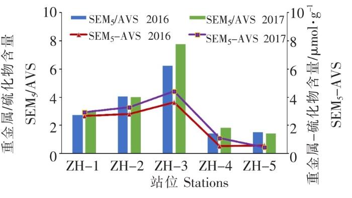樟湖库湾表层沉积物SEM5 /AVS和(SEM5-AVS)