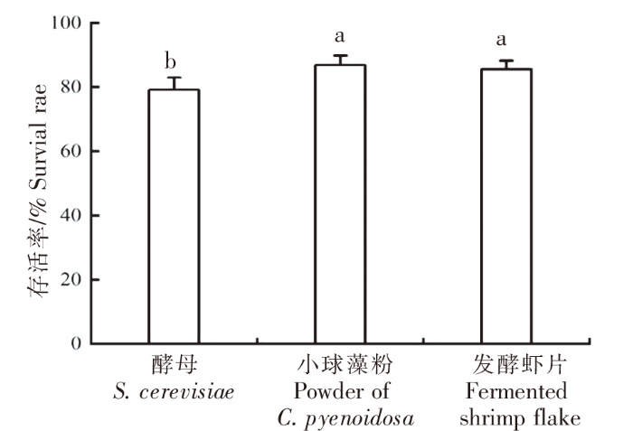 卤虫幼体存活率情况如图 1 所示。小球藻藻粉组的卤虫幼体存活率最高,为(86.87±3.01)%;其次为发酵虾片组,为(85.73±0.50)%;酵母组最低,为(79.17±3.82)%。酵母组的卤虫幼体存活率与小球藻藻粉组、发酵虾片组均差异显著(P<0.05),小球藻藻粉组和发酵虾片组存活率差异不显著(P>0.05)。