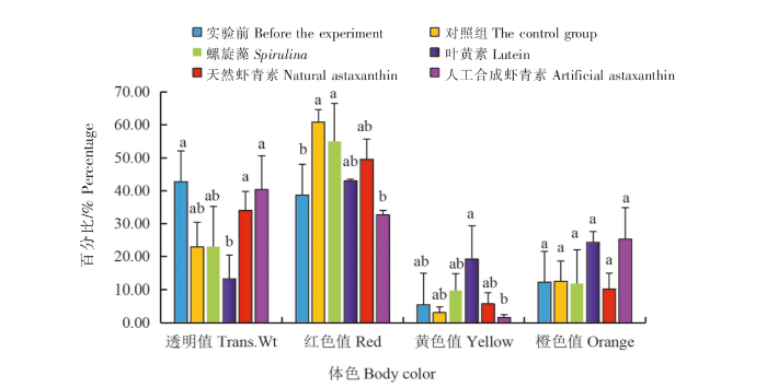 在红色品系中:1)各组中华锯齿米虾体色的透明度值(Trans.Wt)无显著差异(P>0.05)。2)人工合成虾青素组中华锯齿米虾体色的红色值(Red)最大(46.66%),与实验前相比无显著差异(P>0.05),与对照组、螺旋藻组相比差异显著(P<0.05),与叶黄素组和天然虾青素组相比无显著差异(P>0.05)。3)对照组中华锯齿米虾体色的黄色值(Yellow)最大(17.79%),与实验前和4个实验组相比差异显著(P<0.05),而实验前,4个实验组虾体之间的黄色值无显著差异(P>0.05)。4)实验前中华锯齿米虾体色的橙色值(Orange)最大(42.81%),螺旋藻组和叶黄素组的橙色值与对照组、天然虾青素组和人工合成虾青素组相比差异显著(P<0.05),天然虾青素组和人工合成虾青素组的橙色值与对照组之间无显著差异(P>0.05)(图5)。
