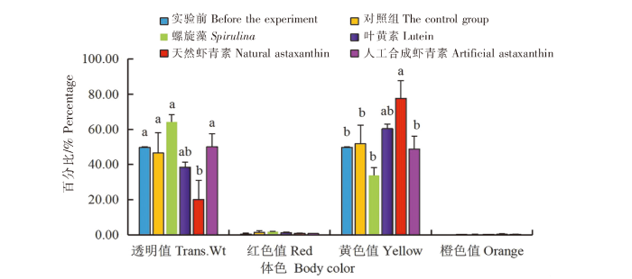 在黄色品系中:1)天然虾青素组中华锯齿米虾体色的透明度值(Trans.Wt)最低(31.17%),与实验前、对照组、螺旋藻组和人工合成虾青素组相比差异显著(P<0.05),与叶黄素组相比无显著差异(P>0.05)。2)各组中华锯齿米虾体色的红色值(Red)无显著差异(P>0.05)。3)天然虾青素组中华锯齿米虾体色的的黄色值(Yellow)最大(77.73 %),与实验前、对照组、螺旋藻组和人工合成虾青素组相比差异显著(P<0.05),与叶黄素组相比无显著差异(P>0.05)。4)各组中华锯齿米虾体色的橙色值(Orange)无显著差异(P>0.05)(图3)。