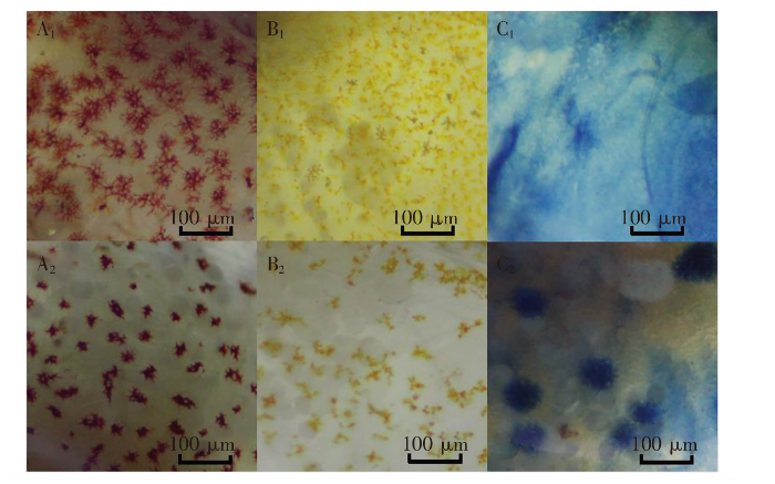 在连续光照条件下,红色品系的中华锯齿米虾体色的透明度值(Trans.Wt)比实验前均有所降低,说明体色在一定程度有所增加;红色值(Red)结果显示,最大值为对照组,最小值为人工合成虾青素组,并且存在显著差异;部分实验组的黄色值(Yellow)和橙色值(Orange)与对照组和实验前相比都有一定程度的提升,但差异不显著。这可能有3种原因:1)从色素状态来看,长时间的光照会影响色素收缩,普通光连续照射可使红色素体发生色素聚集[27-28]。当色素体发生集聚时,红色素体外围会因红色素浓度降低而表现出橙色(图8:A1)。2)从色素合成上分析,在实验后期可能受到某些因素的抑制。类胡萝卜素的氧化途径位于线粒体内膜上,而在氧化过程中叶黄素形成的2,3-脱氢叶黄素和由玉米黄质形成的3,3’-二脱氢叶黄素是更有效的β-胡萝卜素双加氧酶2(BCDO2)氧化应激诱导剂,其会破坏线粒体内膜的氢离子(H+)平衡[29],因此为避免这两种物质造成的破坏,将其排除在线粒体外,或者进一步氧化,但该步骤需要损耗更多的氧。目前光动力效应致靶细胞线粒体损伤的机制研究表明,长期光照可使细胞内光敏剂血卟啉单甲醚(HMME)发生光漂白,导致HMME含量降低,线粒体在光敏化反应中产生较多的活性氧自由基,从而对其造成损伤[30]。因此,光照对红色品系的中华锯齿米虾的线粒体造成了一定的损伤,而为了满足机体的正常呼吸需求,线粒体将类胡萝卜素的大部分氧化途径关闭,造成了中间产物的颜色出现积累。3)在实验过程中,24 h连续光照使对照组的鱼缸出现藻类生长,作为底栖动物的中华锯齿米虾不停地抓食藻类而补充类胡萝卜素,导致对照组体色颜色加深。