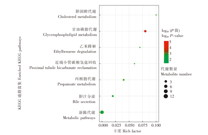 KEGG通路富集结果表明,差异代谢物主要富集于新陈代谢、胆汁分泌、丙酸酯代谢、近端小管碳酸氢盐回收、乙苯降解、甘油磷脂代谢和胆固醇代谢,其中甘油磷脂代谢富集程度最显著(P=0.00);其次为丙酸酯代谢(P= 0.01)、新陈代谢(P= 0.02)。