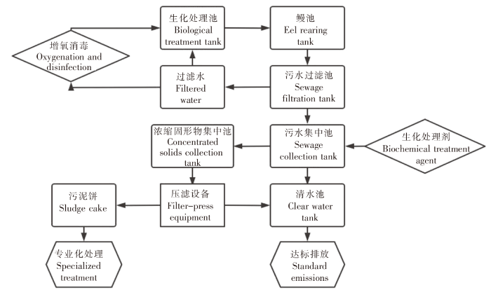 该模式基于传统养殖模式进行改进,在工厂化循环水鳗鲡养殖系统中,鳗池底部的污水通过微滤机进行过滤,过滤后的清水进入生化系统经处理并消毒、曝气增氧后再回流至各个鳗池,形成内循环;过滤后的废水经传统化学处理模式继续处理。该处理模式的具体措施如下:1)鳗鲡养殖尾水经过集中汇聚至固形物集中池,并加入足量的生物处理剂或化学处理剂进行絮凝沉淀。沉淀后的底部污泥和经气浮到表面的固形物收集转移至浓缩固形物集中池进行处理,剩余尾水在满足尾水排放标准后即可排放。2)浓缩固形物集中池中的粪便等污物经过压滤设备压缩成污泥饼,再将污泥饼委托专业公司进行集中处理或利用,而压滤出来的水达到排放标准后即可外排。具体流程见图2。