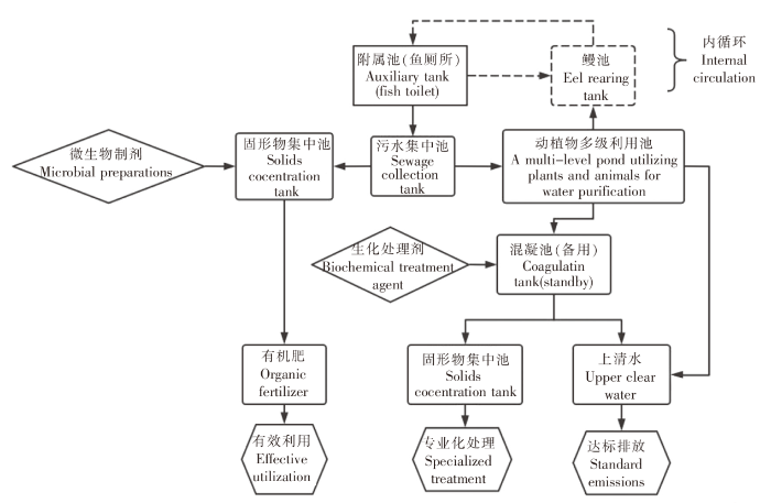 在鳗池旁边增设鱼厕所或鱼污池,建立鳗鲡养殖内循环系统,在菌、藻的水质调控下,可达到很好的减排效果。排出的尾水经过精细过滤等截污系统,通常可去除尾水中90%以上的颗粒物。通过截污系统的尾水再经过菌藻培养等调控,回流至鳗池,实现了鳗鲡养殖的零排放。其处理工艺的特点是“鳗池(内循环)+物理法(沉淀、过滤)+生物法(絮凝、动植物利用、菌藻生化等除污)”。目前已有部分鳗企建立了双循环零排放鳗鲡养殖系统,开展了超过1年的零排放养鳗试验,运行效果十分显著。目前主要问题在于一次性投资较大、操作较复杂、需要掌握的技术难度高、对养殖技术人员的技能和经验等专业素质要求较高等。