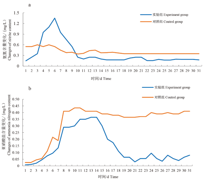 The content variation of ammonia nitrogen (a) and nitrite (b) in the test duration