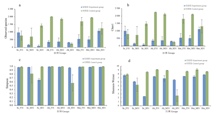 整体而言,3种鱼类各肠道部位实验组Observed species和Chao1指数下降,Shannon-Weiner和Simpson指数下降,细菌丰富度降低。
