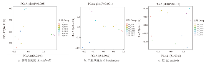 黑脊倒刺鲃、半刺厚唇鱼和鲢PCoA分析最主要特征值PCoA1和PCoA2对样本的差异的贡献值分别合计达到82.35%、83.02%和79.94%,可以代表大部分变量信息。除黑脊倒刺鲃前肠和鲢后肠外,3种鱼类其他不同肠道部位中,实验组与对照组各自区分聚类,可用于后续信息分析(图3)。
