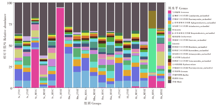 3种鱼类肠道菌群以及同种鱼类不同肠道在属水平优势菌群差异较大,各肠道样本菌属比较丰富,且丰度较为均一。整体而言,气单胞属、弧菌属在3种鱼类各肠道部位的丰度均下降,芽孢杆菌属在3种鱼类各肠道部位的丰度均上升。